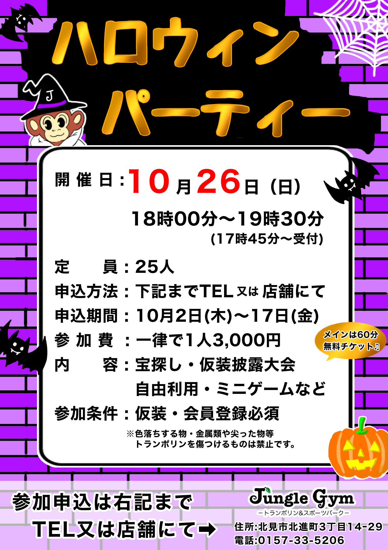 いつものトランポリンとは違う雰囲気の中、仮装して跳んだり、沢山のミニゲームをして毎年大盛り上がりです♫
