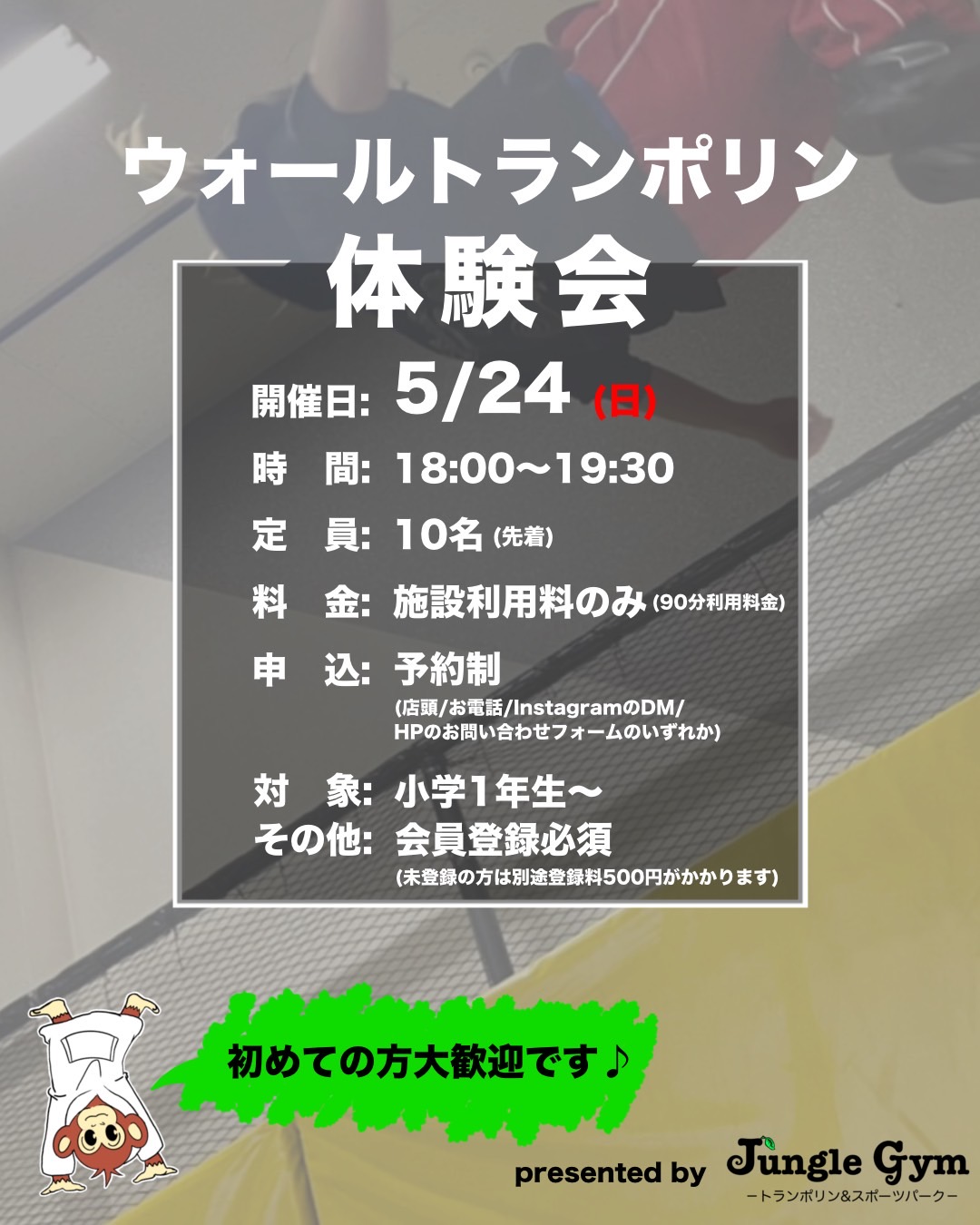 是非このウォールトランポリンを沢山の人に体験してもらいたいので体験会を開催しちゃいます!