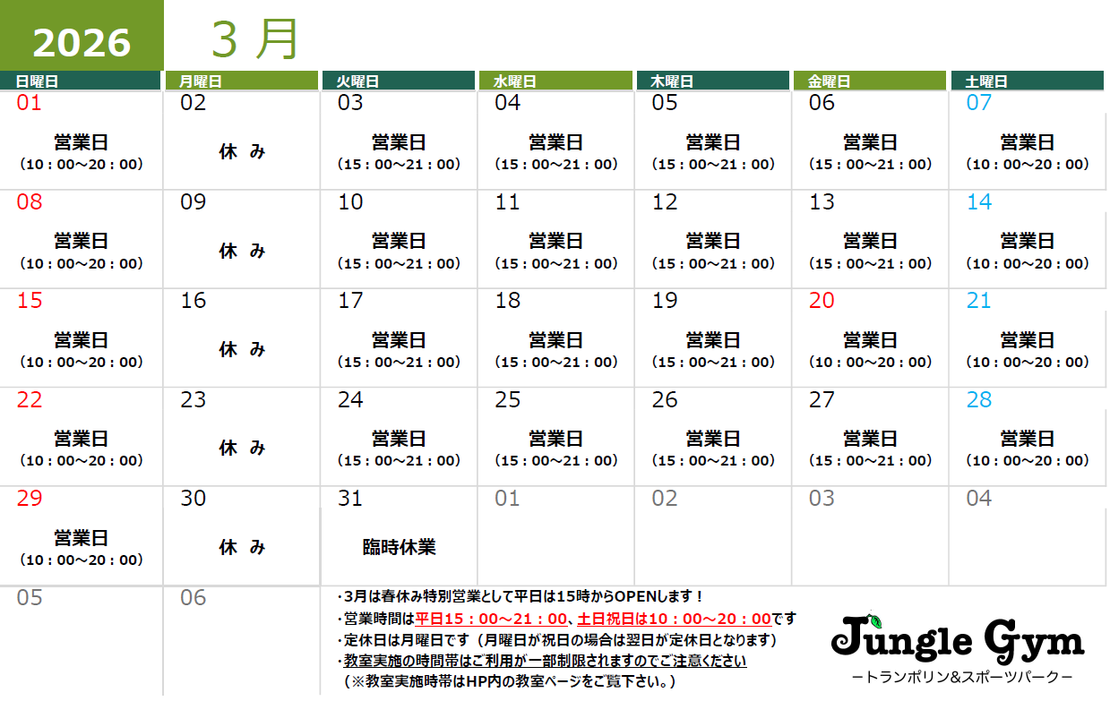 ジャングルジムの営業日やイベント日程はこちらからご確認ください。