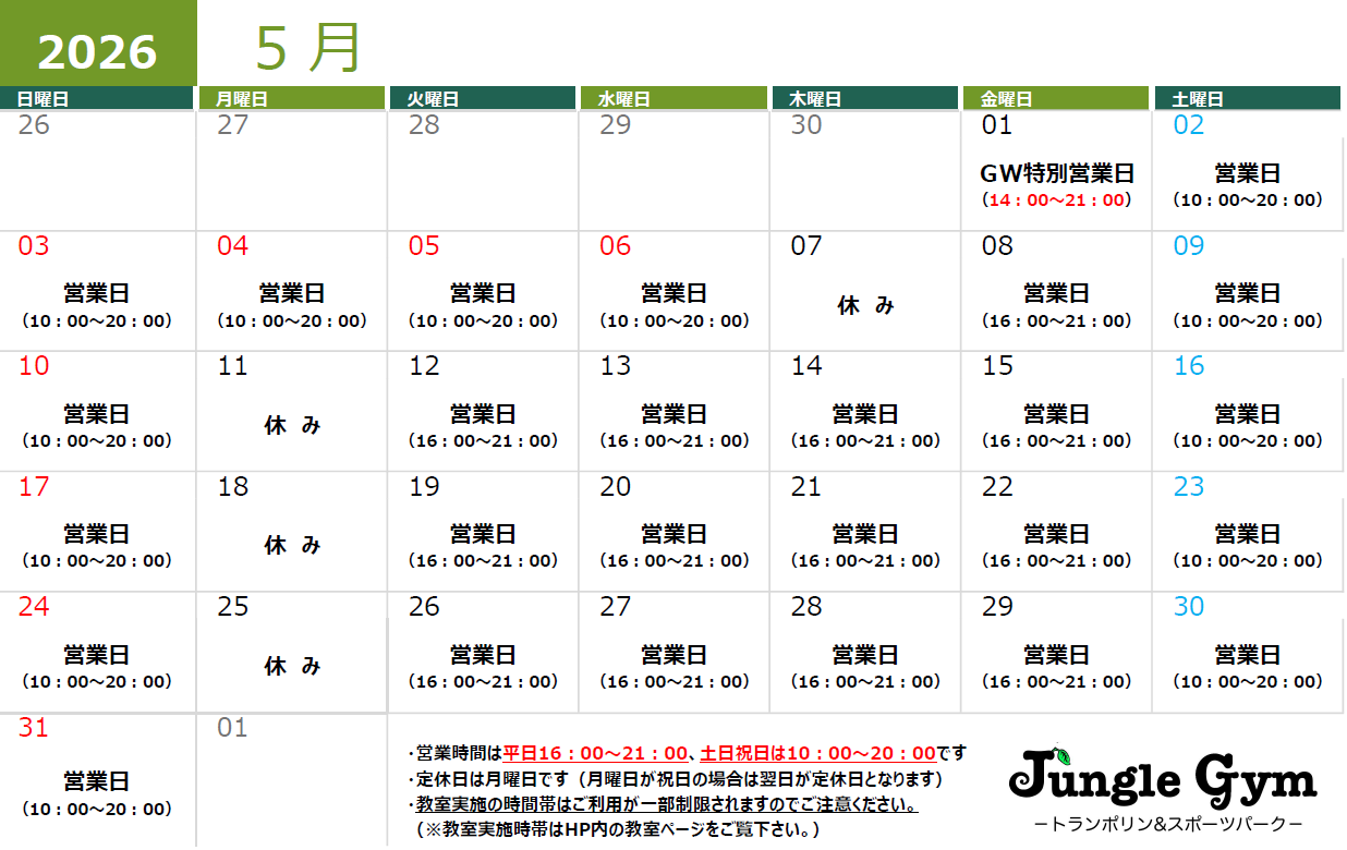 ジャングルジムの休日やイベント日程はこちらからご確認ください。