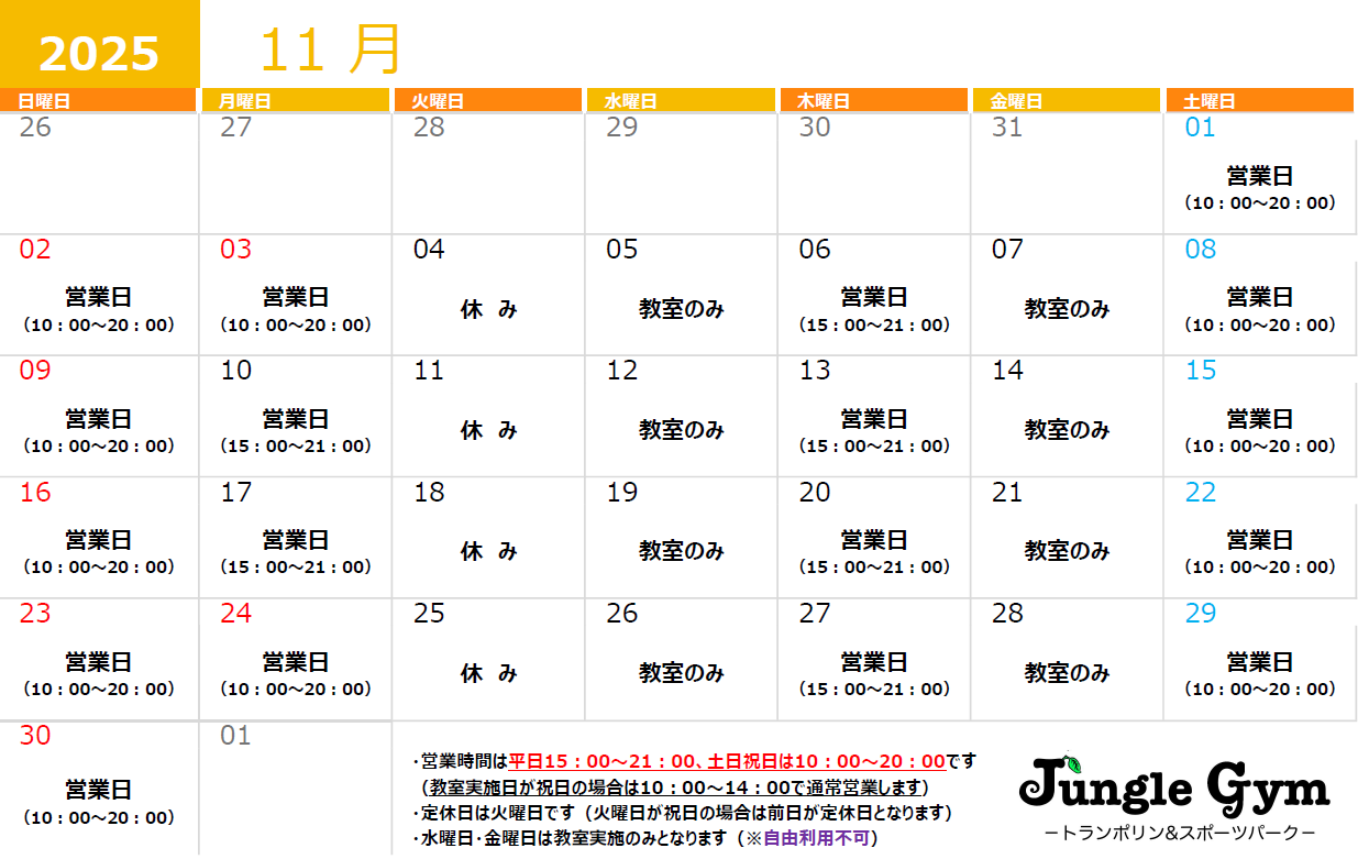 ジャングルジムの営業日やイベント日程はこちらからご確認ください。