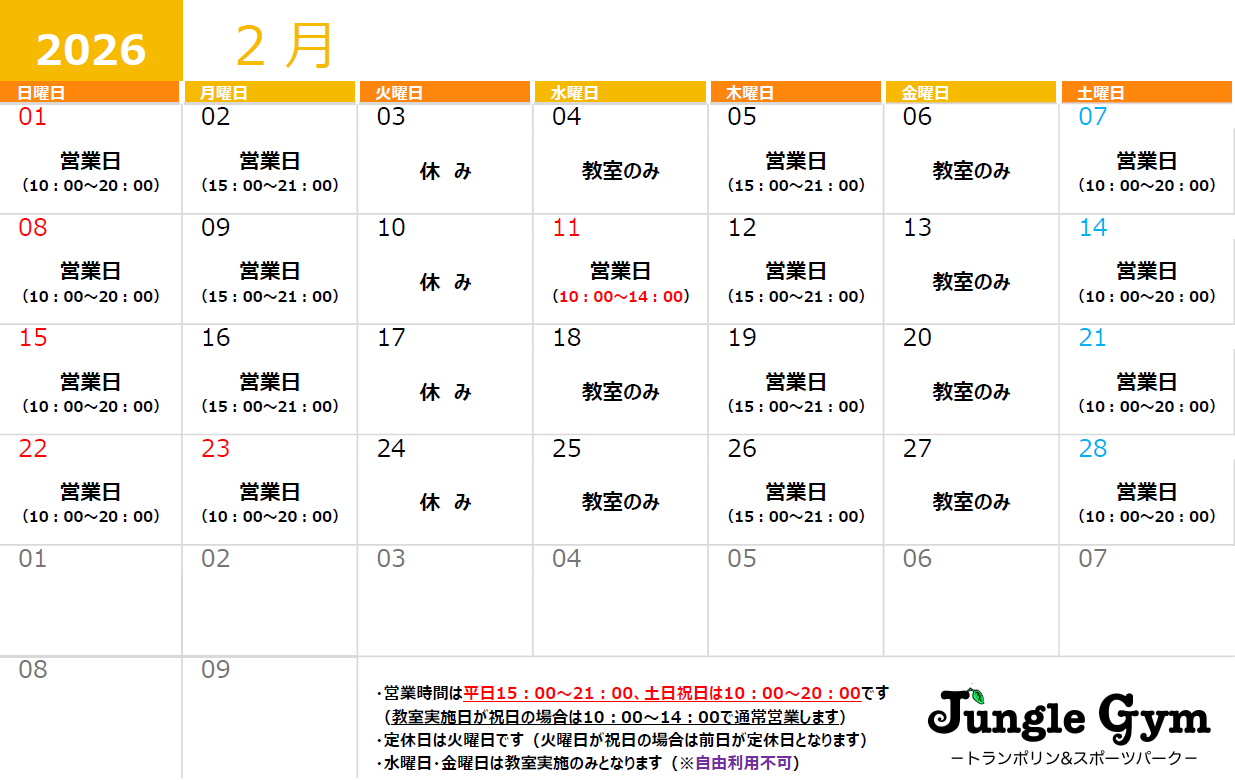 ジャングルジムの営業日やイベント日程はこちらからご確認ください。